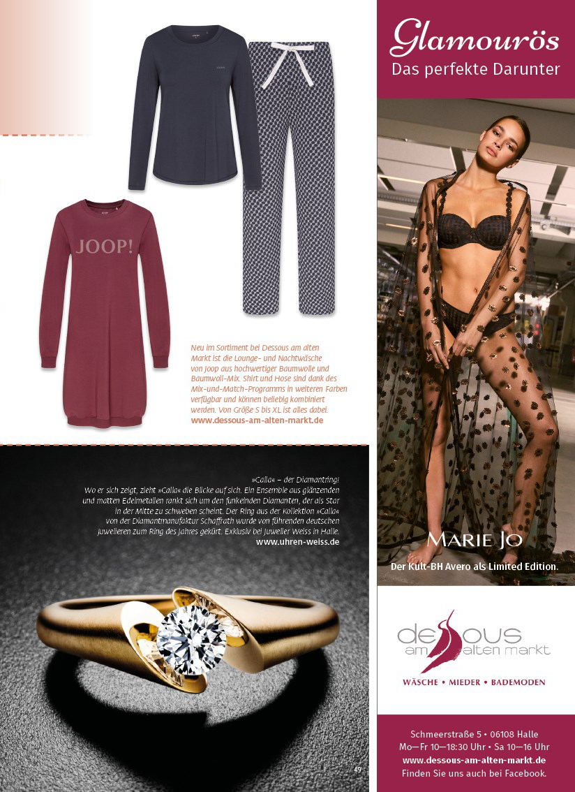 In der Winterausgabe stellen wir die Jubiläumskollektion von der Dessous-Marke Marie Jo vor. Die sinnliche Limited Edition des Kult-BHs wurde anlässlich des Jubiläums des Belgischen Dessous-Konzern Van de Velde kreiert und ist bei uns im Laden erhältlich.